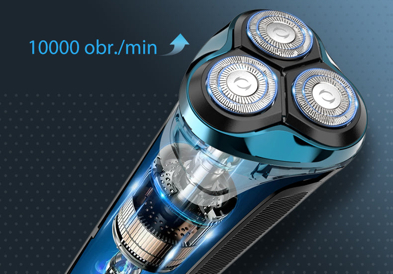 Trzy niezależnie poruszające się głowice tnące przesuwają się po konturach (linia żuchwy, szyja, podbródek), zapewniając precyzyjne golenie.